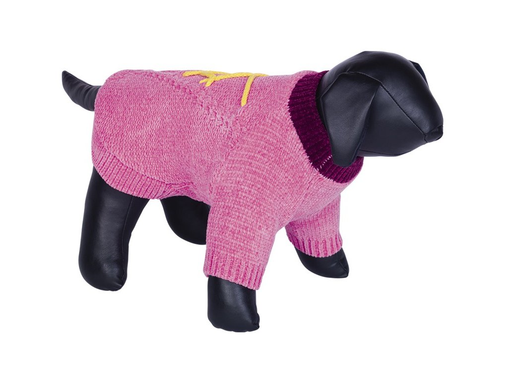 Pletený svetr pro psy značky Nobby. Barva růžová s žlutým designovým provázkem na zádech. Materiál: mikrovlákno (polyester). Nohavičky na předních nohách.