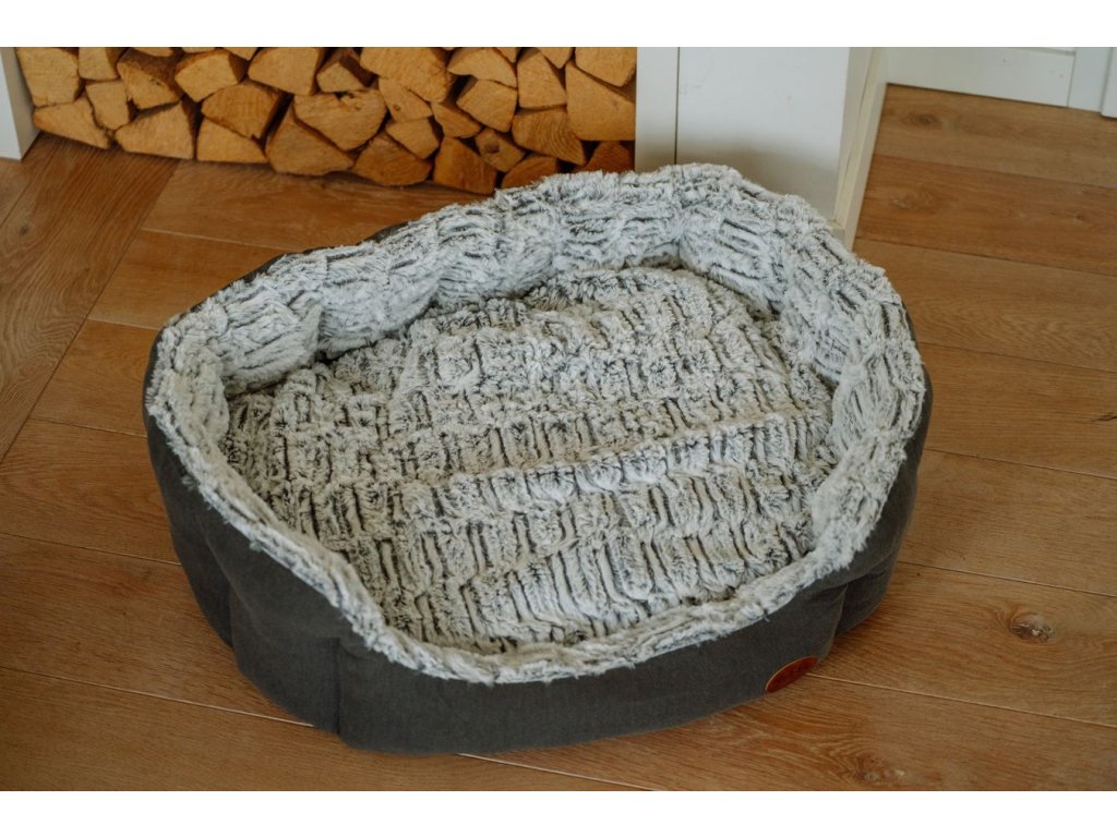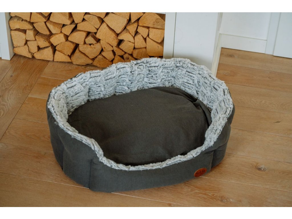 Velmi kvalitní oválný pelíšek pro malé psy s oboustranným polštářem. Barva šedá.