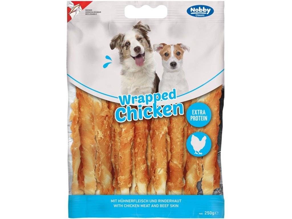 Hýčkejte svého psa lahodnými kuřecími tyčinkami s 73,1% jemného kuřecího masa a 23,9% vysoce kvalitní hovězí kůže