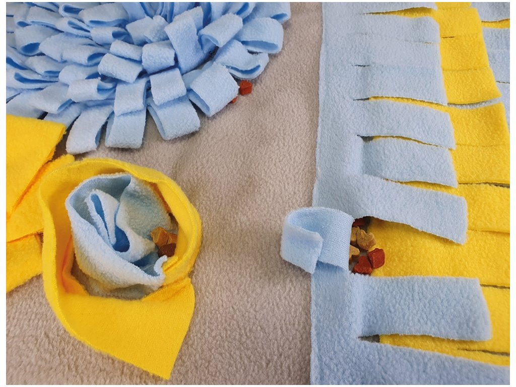 Použití: Pamlsky položíme na povrch deky, aby je zvíře vidělo. V dalším kroku pamlsky napůl schováváme. A nakonec už můžeme pamlsky pečlivě skrýt do čichací deky.
