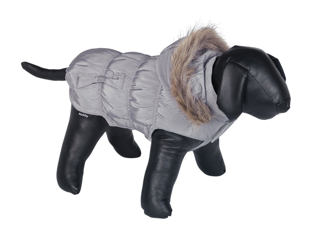 Vzhledově velmi moderní zimní bunda značky Nobby. Kabátek pro psy je funkčním doplňkem v zimním období. Barva šedá s kožíškem a odnímatelnou kapucí. Obleček má elastický hrudní pás, zapínání na hrudníku a u krku na suchý zip. Vnější použitý materiál ze syntetických vláken, který chrání před deštěm a větrem.