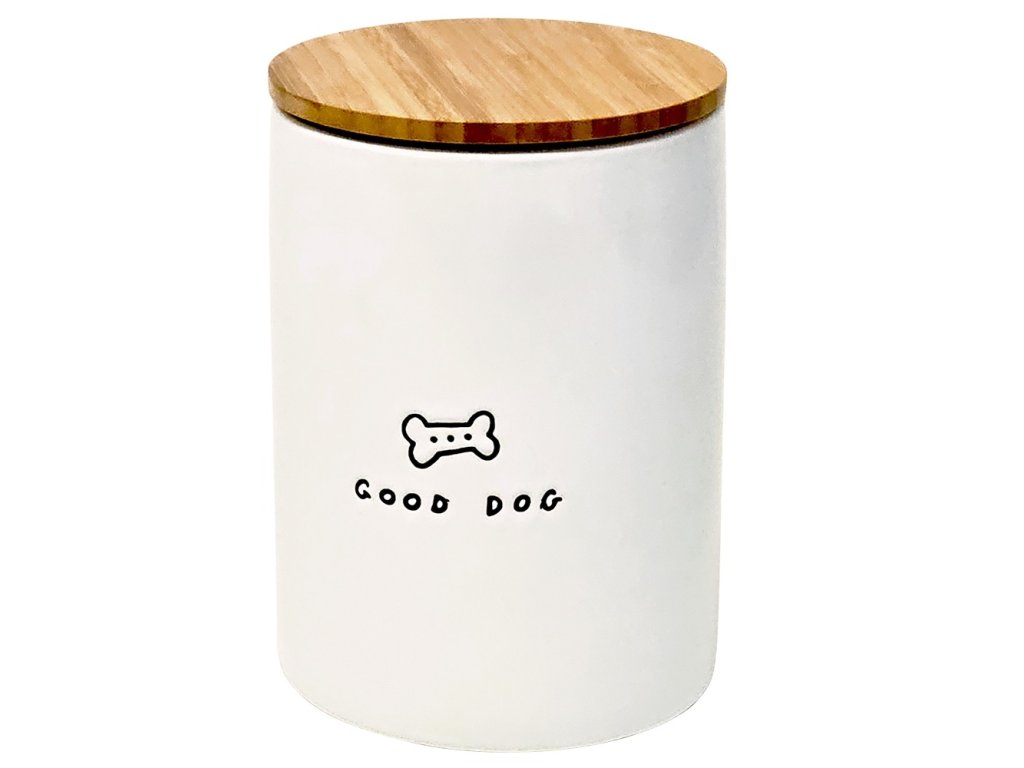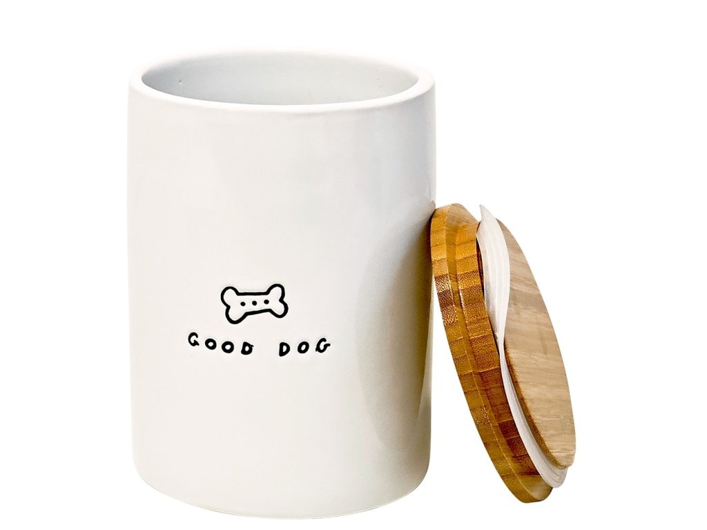 Elegantní bílý design s jemným motivem kosti a nápisem „GOOD DOG“ doplňuje přírodní bambusové víko, které dodává dóze moderní vzhled.