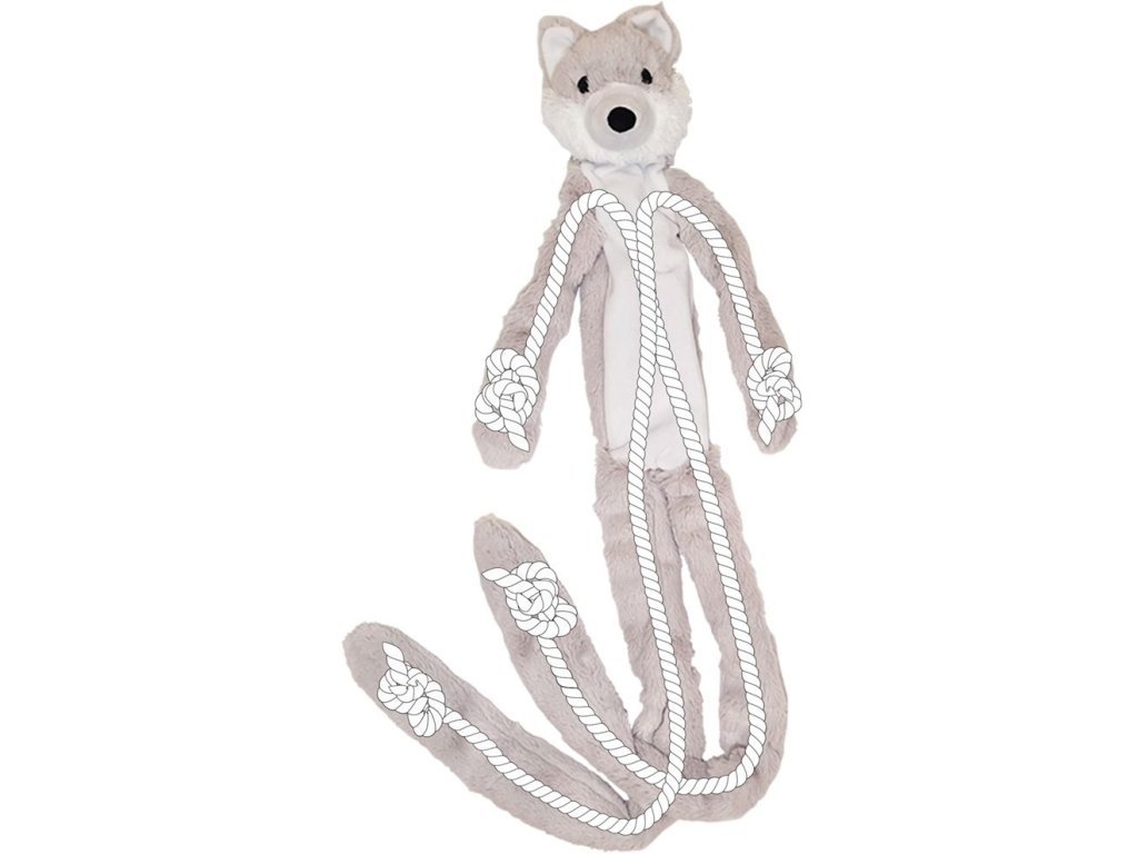Hračka pro psy ke kousání a zábavu. Vlk v šedé barvě a celkovým rozměrem 105 cm. Hračka je ideální pro psy, kteří chtějí hrát a mazlit se. Je ideální k mazlení a vnitřní lano s uzly jsou určeny k tahání a hraní.