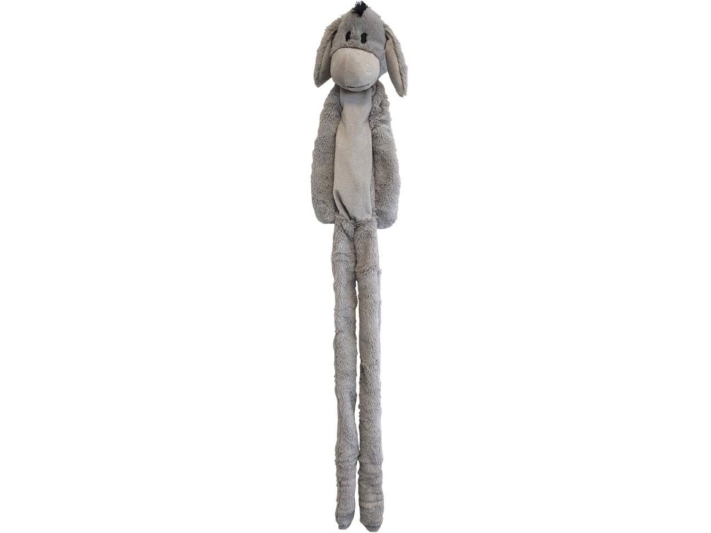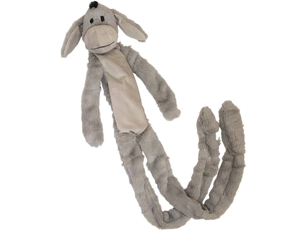 Hračka pro psy ke kousání a zábavu. Oslík v šedé barvě a celkovým rozměrem 105 cm. Hračka je ideální pro psy, kteří chtějí hrát a mazlit se. Je ideální k mazlení a vnitřní lano s uzly jsou určeny k tahání a hraní.