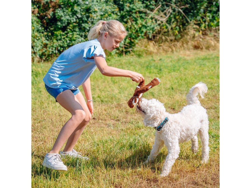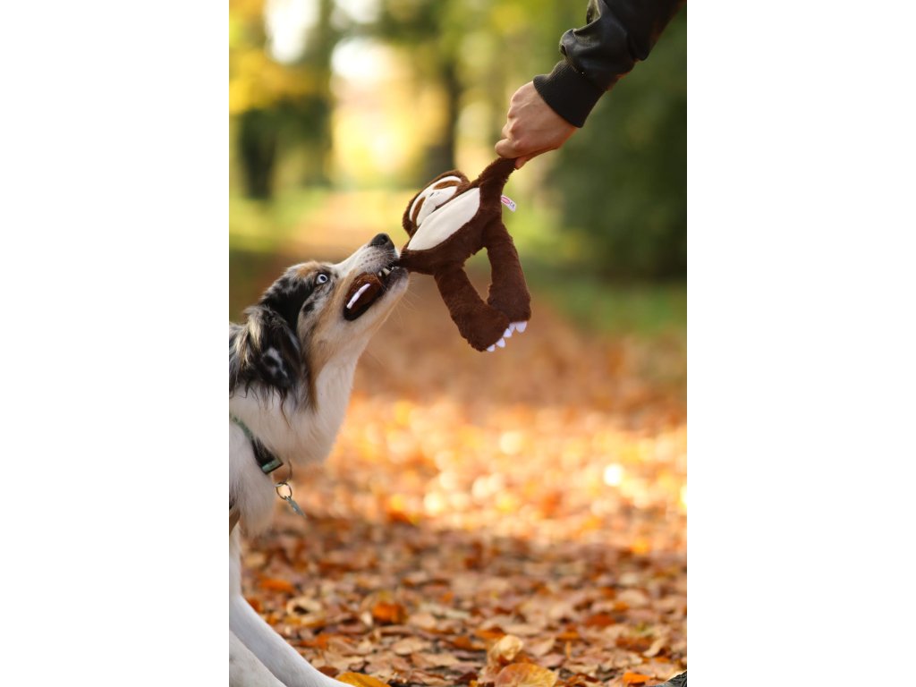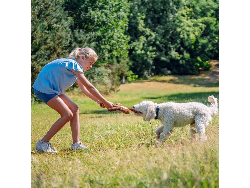 Hračka disponuje všitým lanem, čímž pes při kousání tuto hračku rychle nezničí.