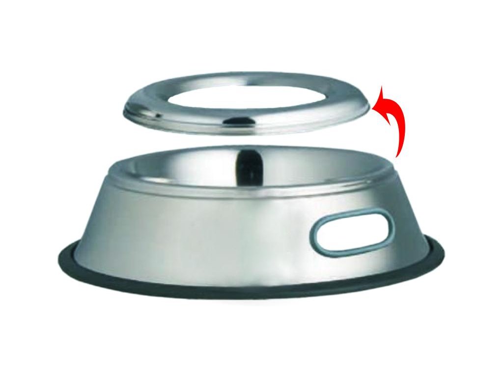 Speciální miska zabraňující vylévání vody a vypadávání potravy. Vyrobeno z ušlechtilé nerezové ocely. S protiskluzovým kroužkem a otvorem pro snadné přenášení.