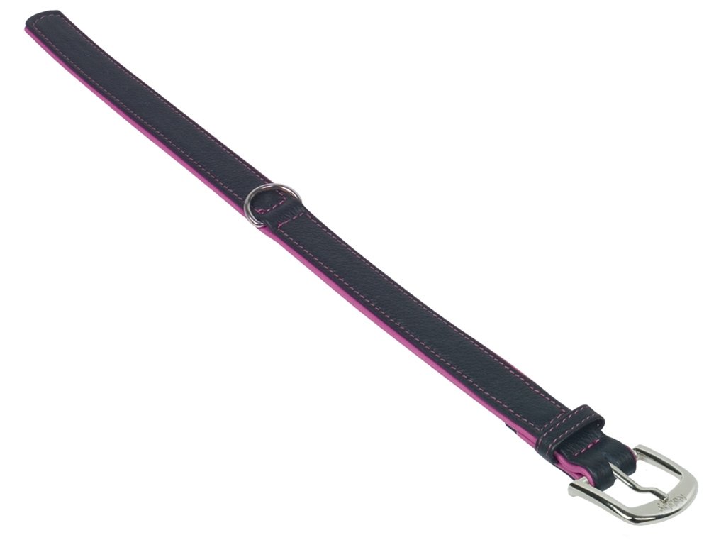 Pevný prošitý obojek pro psy z hladké měkké hovězí kůže. Vrchní strana obojku černá, elegantní barevné lemování na spodní straně obojku. Vyrobeno z italské kůže (certifikované EU).