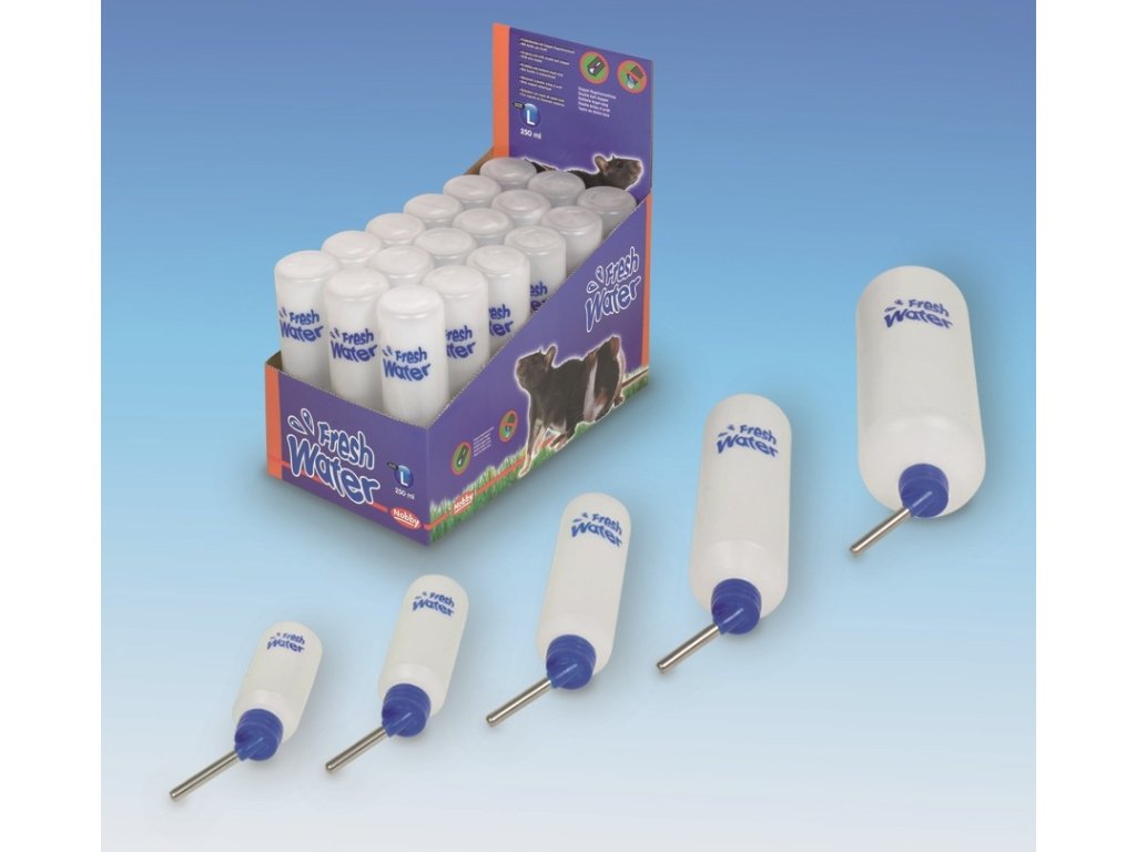 Plastová napaječka pro hlodavce. Dvojitý kulíčkový uzávěr. S drátovým držákem. Objem 150ml.