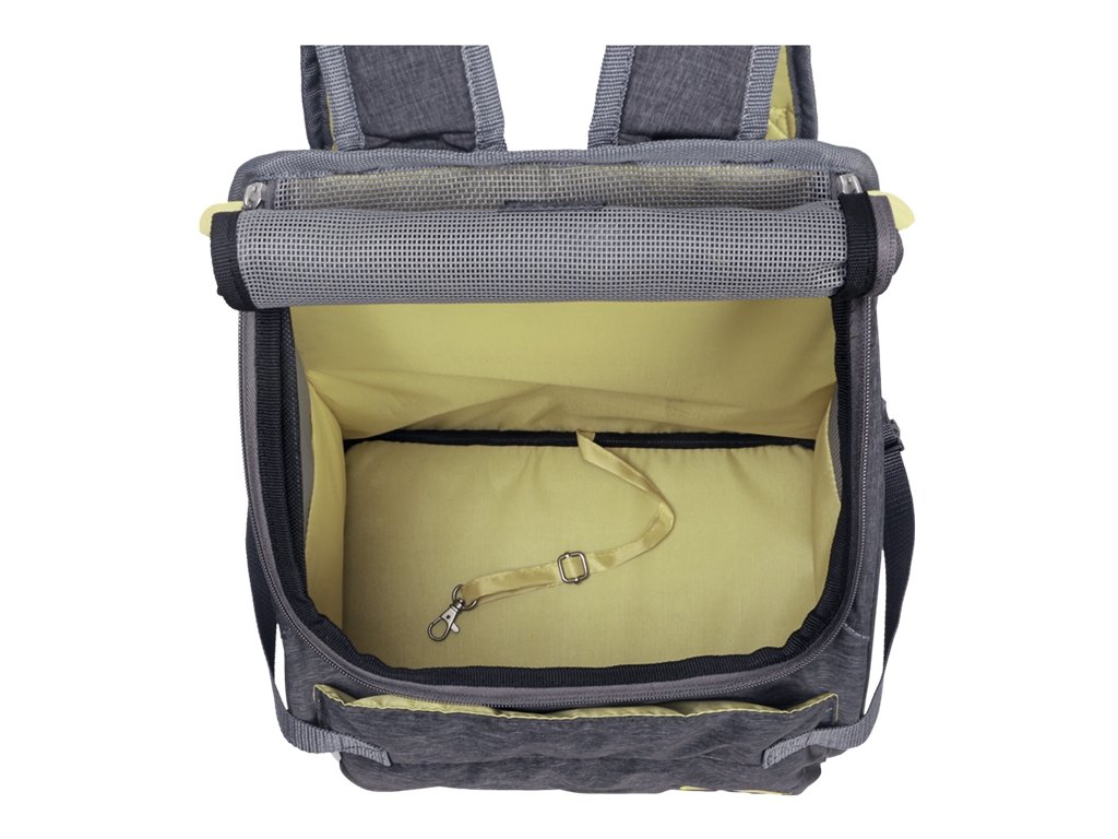 S plně nastavitelnými popruhy na rameni. Integrovaná karabina zabraňuje vašemu pejskovi ve vyskočení ven. Síťové části zaručují cirkulaci vzduchu uvnitř i při zavřené klokance. Maximální nostnost 7 kg. Možnost otevření horního síťové okna tak, aby zvíře vystrčilo hlavu. Velká kapsa na potřeby.