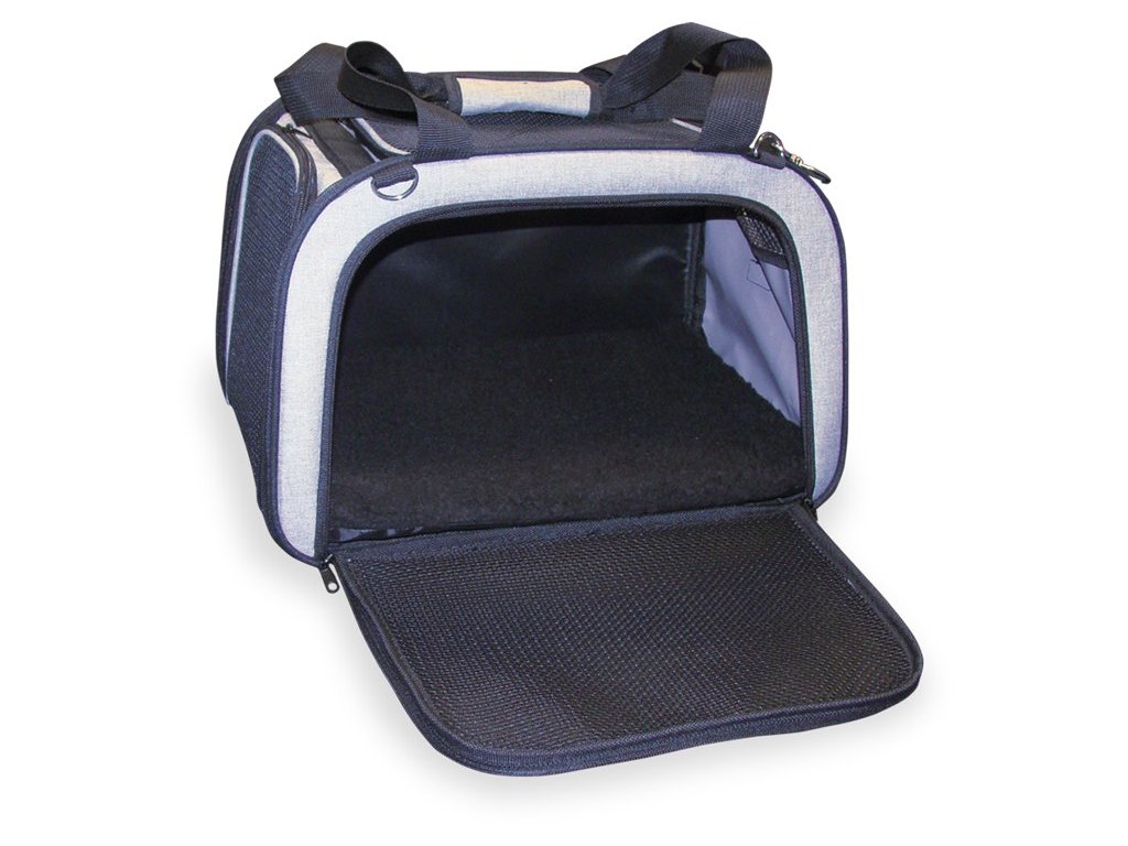 Přepravní taška pro kočky a malé psy do maximální hmotnosti 7 kg. Vyrobená z odolného omyvatelného mikrovlákna. Velké otvory ze síťoviny na 4 stranách, 3 otvory jsou zcela otevřít. Integrovaná karabina uvnitř tašky zabraňuje zvířeti ve vyskočení ven.