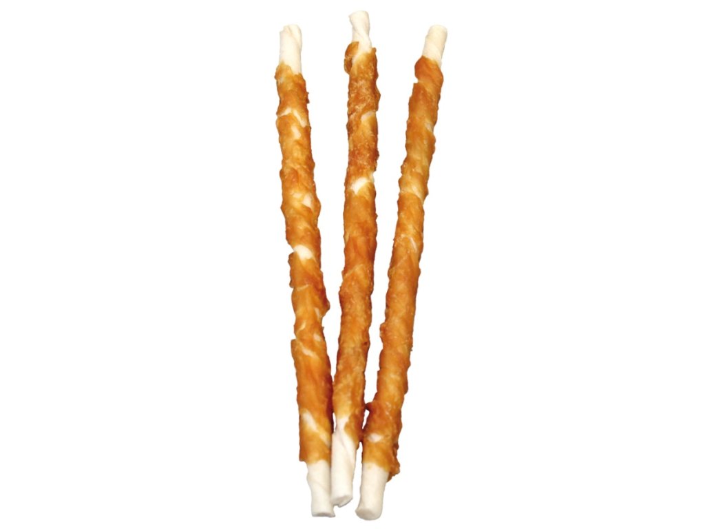 Sušená hovězí kůže obalená kuřetem je doplňkové krmivo, které slouží k posílení žvýkacích svalů, podporuje dentální hygienu a napomáhá odstraňování zubního povlaku.