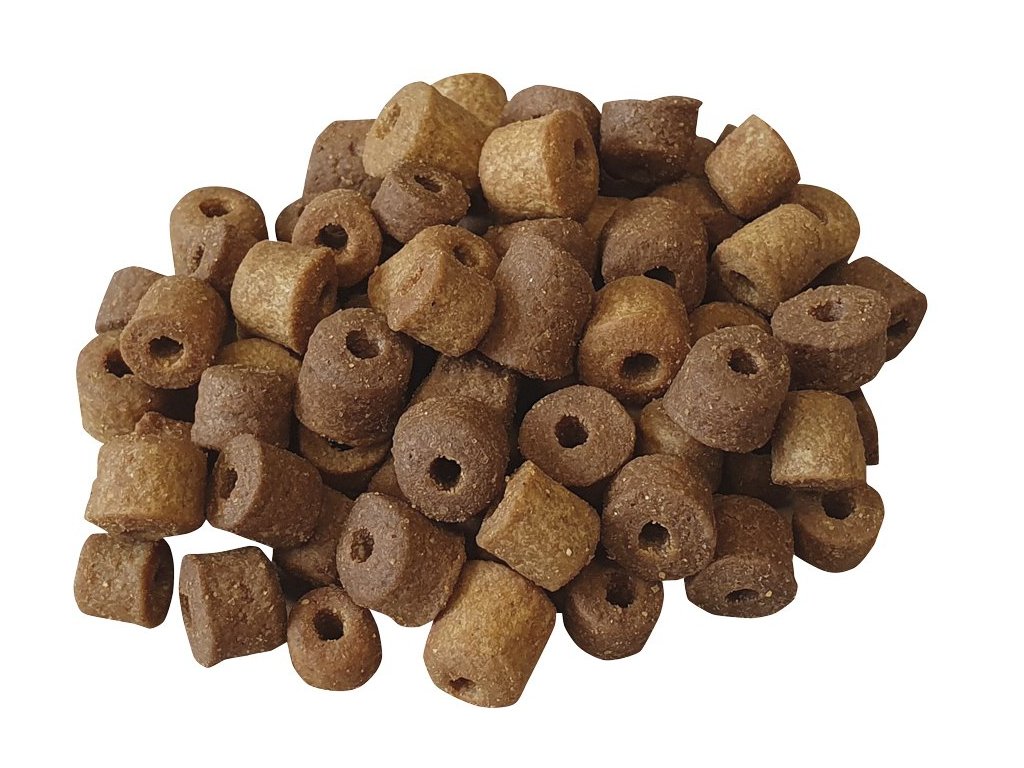 cereálie, maso a živočišné produkty (14% kuře, 1 % kuřecí játra), oleje a tuky, bílkovinné rostlinné extrakty, vedlejší produkty rostlinného původu, minerální látky, kvasnice.