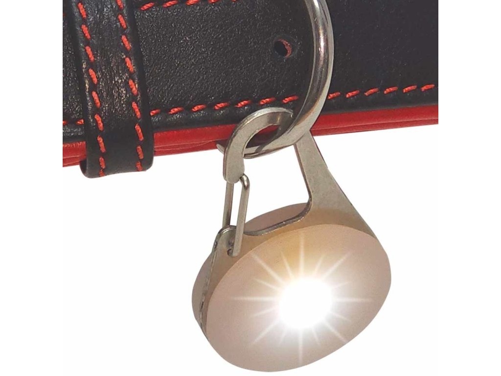 Bezpečnostní světelný přívěsek LED. Snadné připevnění např. na obojek nebo postroj pomocí kovového háčku. Vhodné pro všechny obojky a vodítka, univerzálně použitelné. Součástí balení je baterie.