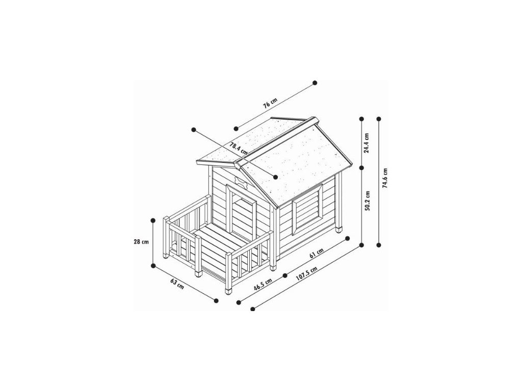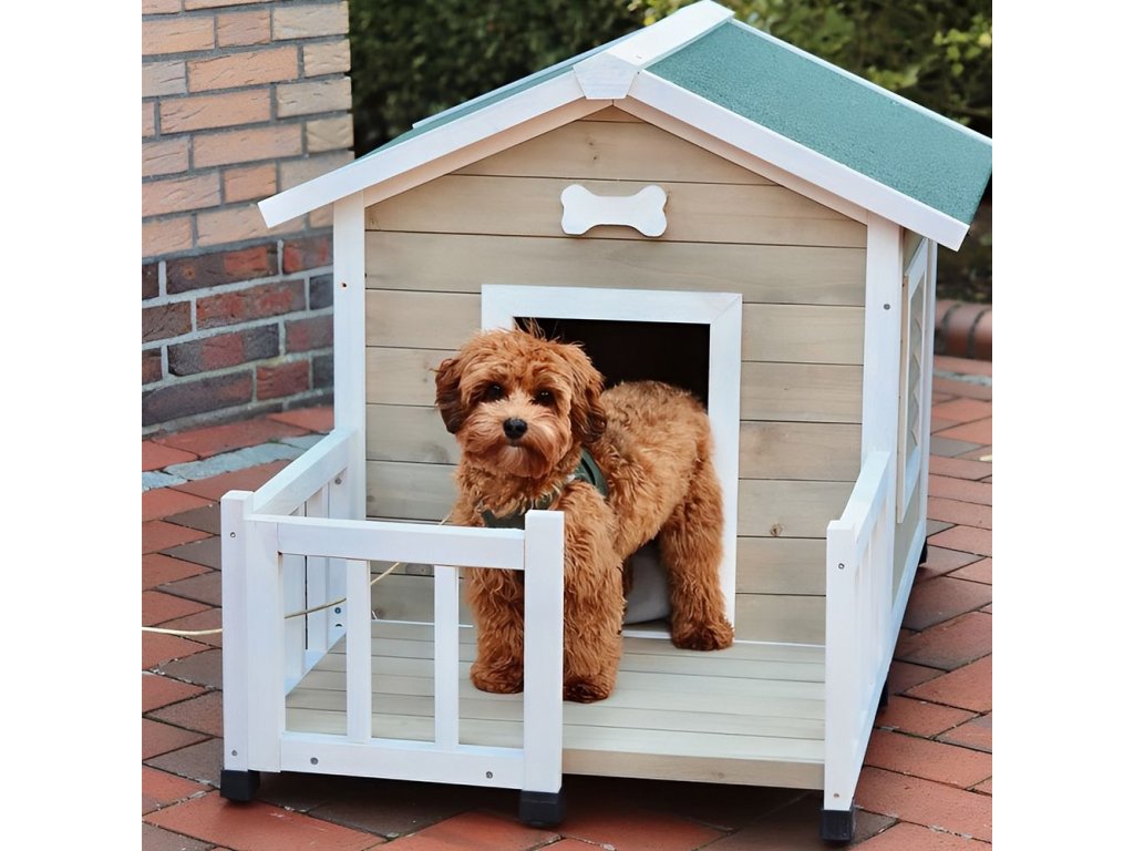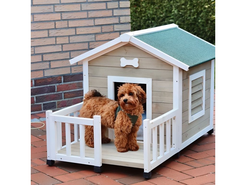 Stylový bouda s terasou pro psa. Vysoká kvalita a perfektní provedení. Snadné čištění díky odnímetlné podlaze. Odolné proti povětrnostním podmínkám.