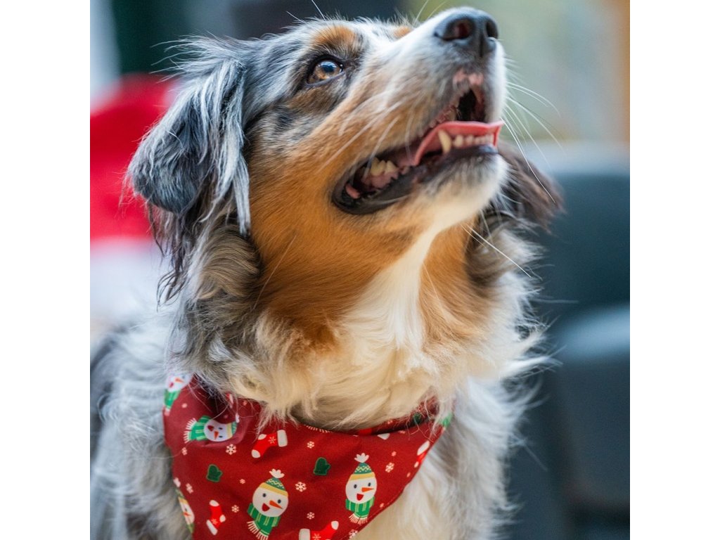 Ozdoba bavlněného šátku v červeném vánočním designu dodává obojku styl a jedinečnost.