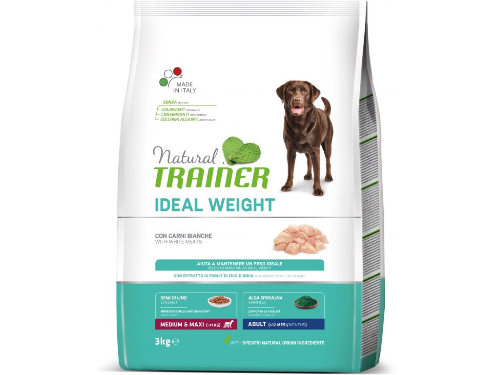 Trainer Natural Weight care drůbeží maso je prémiové kompletní krmivo pro dospělé psy středních plemen se sklony k nadváze. Krmivo slouží pro udržení optimální hmotnosti psa – light receptura se 100% naturálními ingrediencemi. Maso má ve směsi největší zastoupení a je bez přidaných barviv, umělých konzervantů a dochucovadel. Rozměry a obsah granulí jsou vyvinuté dle požadavků psů středních plemen s obsahem nukleotidů - extraktem z kvasnic na posílení imunitního systému psů a s rozpustnou rostlinnou vlákninou a probiotiky pro zajištění správné funkce trávicího ústrojí. Obsahuje přídavek z juky na kontrolu zápachu exkrementů a pro její protizánětlivé vlastnosti a mořskou řasu pro podporu trávení, vitality a kvalitu srsti. Extrakt z jablka pro dokonalou dentální hygienu s extraktem z citrusových plodů na podporu trávení.