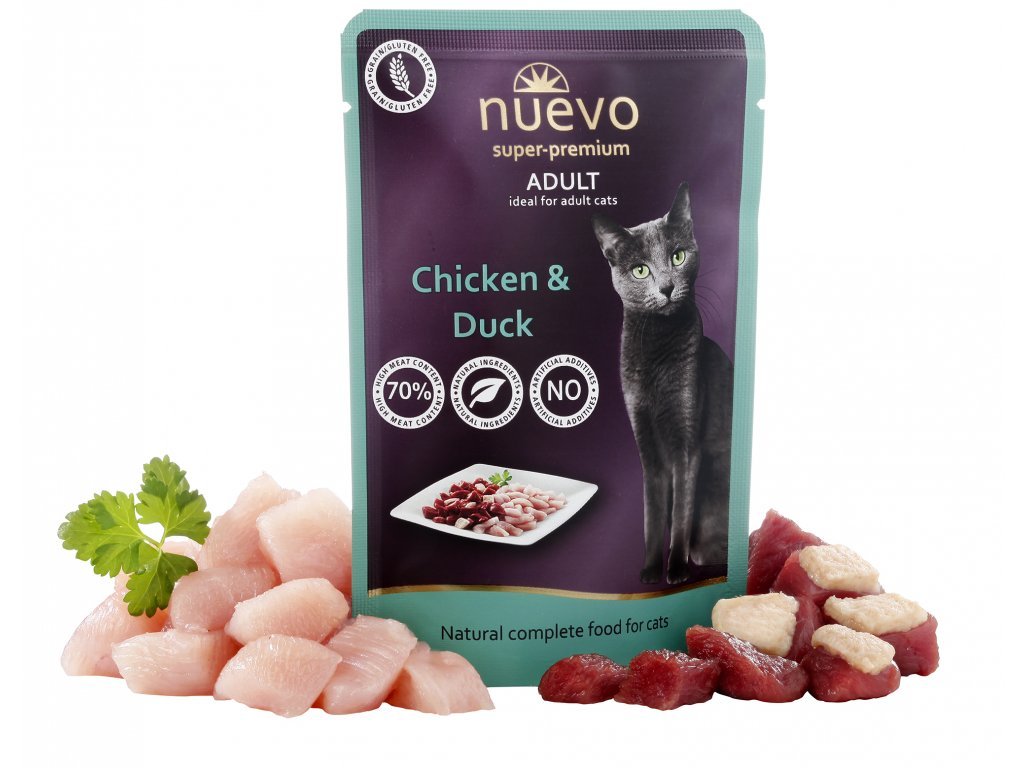 Kapsička Nuevo Adult s kuřecím a kachním masem. Jedinečná, superprémiová kapsička pro dospělé kočky všech plemen. Vyniká svým extra vysokým obsahem masa (72%), které je doplněno vývarem s plnou chutí.
