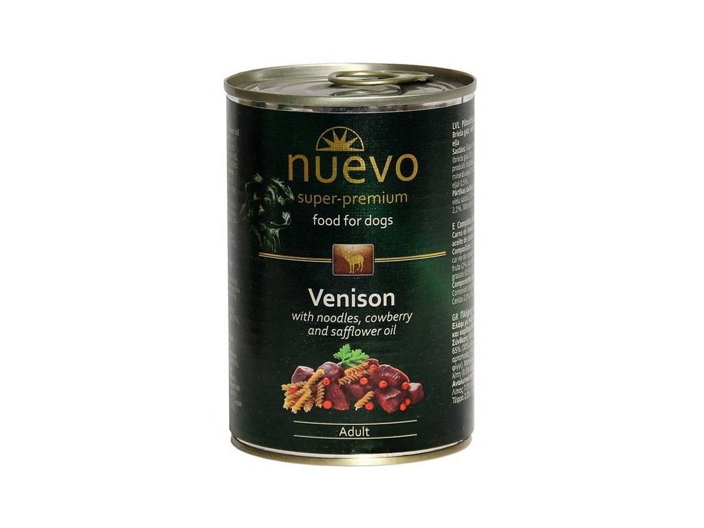 Konzerva Nuevo Zvěřinové menu je vhodná pro dospělé psy všech plemen. Vysoký obsah masa společně s nudlemi a vynikajícím světlicovým olejem jsou tím nejlepším z této receptury. Světlicový olej podporuje zdravou srst díky dokonalé kombinaci esenciálních mastných kyselin a podněcuje dobré trávení.