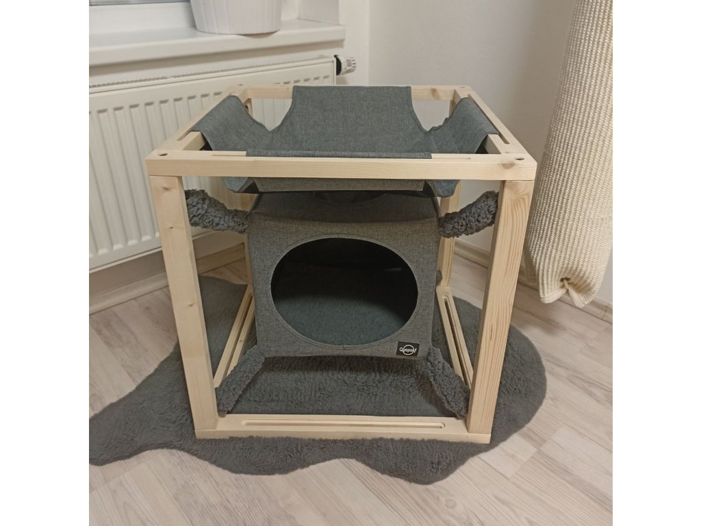 Kočičí designový domeček od značky Quapas! je to nejlepší místo, kde si můžete vaše kočka skvěle odpočinout. Kočka má na výběr mezi úžasně chráněným místem v krychli nebo v horní části houpací sítě s výhledem do místnosti.
