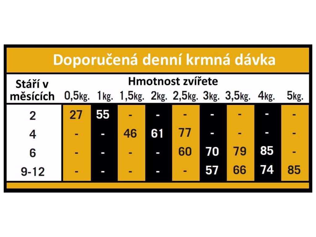 Snadno stravitelné sacharidy, pro zajištění kvalitní srsti, kůže a podporu trávení. Obsah omega 3 a 6 esenciálních mastných kyselin pro správný rozvoj nervového a kardiovaskulárního systému. Obsah zinku napomáhá udržovat zdravou kůži a lesklou srst. FOS + MOS s prebiotickými účinky přispívá ke zdraví trávícího traktu. Taurin pro správnou funkci srdce, zraku a předcházení trávícím poruchám.