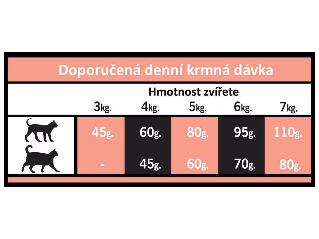 Analitické složky: Hrubý protein 31 %, hrubý olej a tuky 17 %, mastné kyseliny omega 6: 2,9 %, mastné kyseliny omega 3: 0,8 %, hrubá vláknina 3,5 %, celková dietní vláknina 6,5 %, hrubý popel 7,5 %, vápník 1,3 %, fosfor 1,1 %.