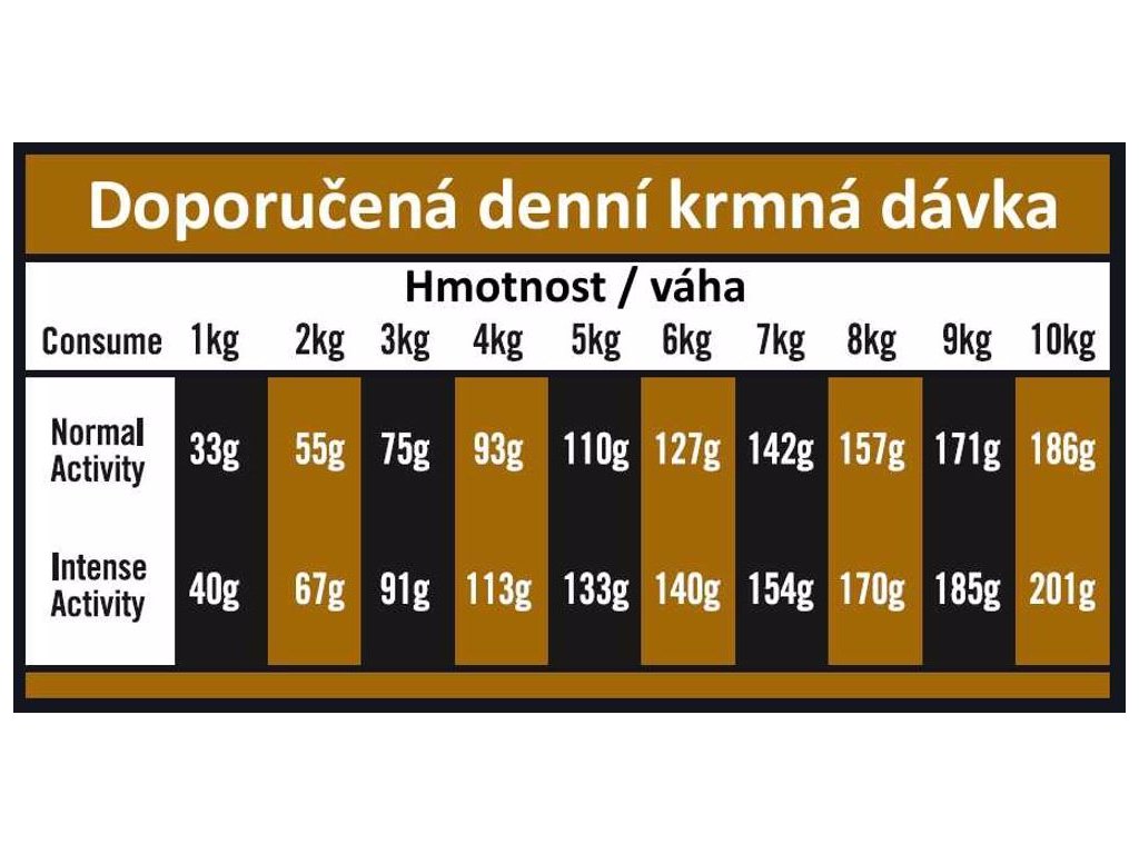 Jako jediný zdroj živočišných bílkovin s vyváženým poměrem bílkovin a tuku je použito kuřecí maso - monoproteinová strava výrazně snižuje riziko vzniku intolerancí a potravinových alergií. Krmivo neobsahuje obiloviny je tedy hypoalergenní a snadno stravitelné .
