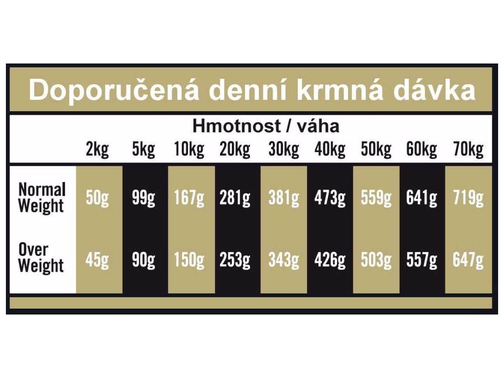 Jako jediný zdroj živočišných bílkovin s vyváženým poměrem bílkovin a tuku je použito kuřecí maso - monoproteinová strava výrazně snižuje riziko vzniku intolerancí a potravinových alergií.