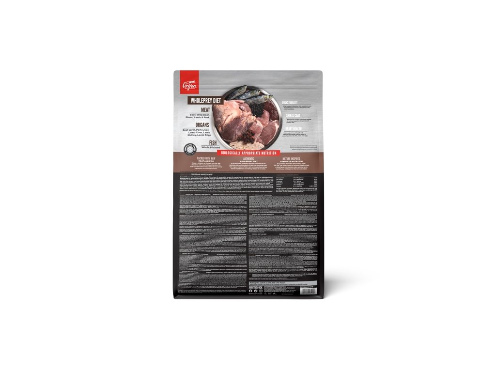 Čerstvé hovězí angus 8 %, čerstvý divoký kanec 4 %, čerstvý bizon 4 %, čerstvé nebo syrové jehněčí 4 %, čerstvé vepřové 4 %, čerstvá hovězí játra 4 %, čerstvá kančí játra 4 %, čerstvé hovězí dršťky 4 %, čerstvá celá sardinka 4 %, čerstvá celá vejce 4 %, jehněčí maso (dehydrované, 4 %), hovězí maso (dehydrované, 4 %), celý sleď (dehydrovaný, 3,5 %), celá sardinka (dehydrovaná, 3,5 %), skopové (dehydrované, 3,5 %), hovězí tuk 3,5 %, čerstvé hovězí ledviny 3,5 %, čerstvá hovězí srdce 3,5 %, vepřové maso (dehydrované, 3,5 %), červená čočka, zelená čočka, zelený hrách, vláknina z čočky, cizrna, žlutý hrách, fazole pinto, čerstvá vepřová játra 1,5 %, čerstvá jehněčí játra 1,5 %, aljašská treska (dehydrovaná, 1,5%), olej ze sledě 1 %, jehněčí dršťky 1 %, hovězí chrupavky (dehydrované, 1%), na slunci sušená vojtěška, hovězí játra (mrazem sušená), hovězí dršťky (mrazem sušené), jehněčí játra (mrazem sušená), jehněčí dršťky (mrazem sušené), čerstvá dýně, čerstvá máslová dýně, čerstvá cuketa, čerstvý pastinák, čerstvá mrkev, čerstvá jablka, čerstvé hrušky, čerstvá kapusta, čerstvý špenát, čerstvé listy červené řepy, čerstvé listy tuřínu, hnědá mořská řasa, čerstvé brusinky, čerstvé borůvky, čerstvé plody muchovníku, kořen čekanky, kurkuma, ostropestřec, kořen lopuchu, levandule, kořen ibišku, šípky.