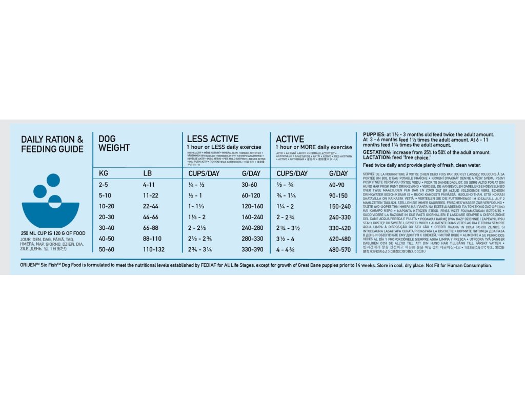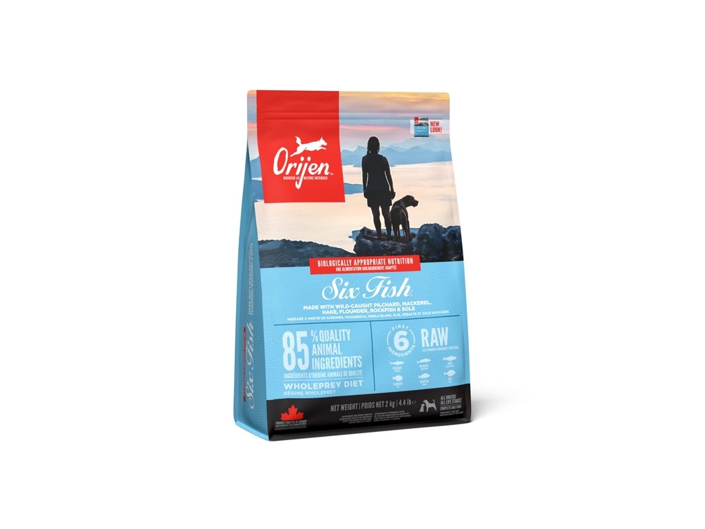 Orijen Dog 6 Fisch (6 čerstvých ryb) je kompletní, vyvážené, plnohodnotné krmivo pro psy všech plemen a všech věkových stádií s masem ze šesti druhů ryb, s bylinkami a mořskou zeleninou.