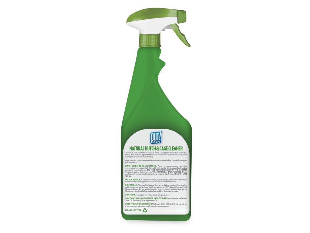 OUT! čistič klecí a vybavení pro hlodavce čistí a osvěžuje klece a králíkárny. Snadná a efektivní aplikace. Přírodní a šetrné složení (přírodní oleje včetně máty peprné, hřebíčku a eukalyptu). Preventivní použití proti vodnímu kameni.