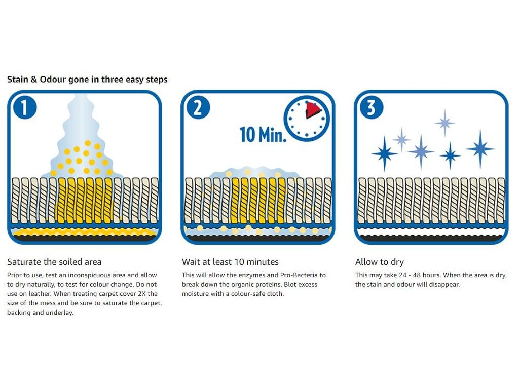 účinně odstraňuje odolné skvrny a zápachy (moč, zvratky, výkaly, krev, hlína a tráva)
