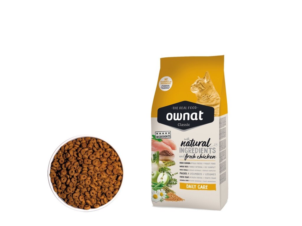 Krmivo OWNAT CLASSIC CAT Daily Care je skvělou volbou pro každodenní výživu koček všech plemen, zajišťuje jim zdraví a vitalitu po celý den.