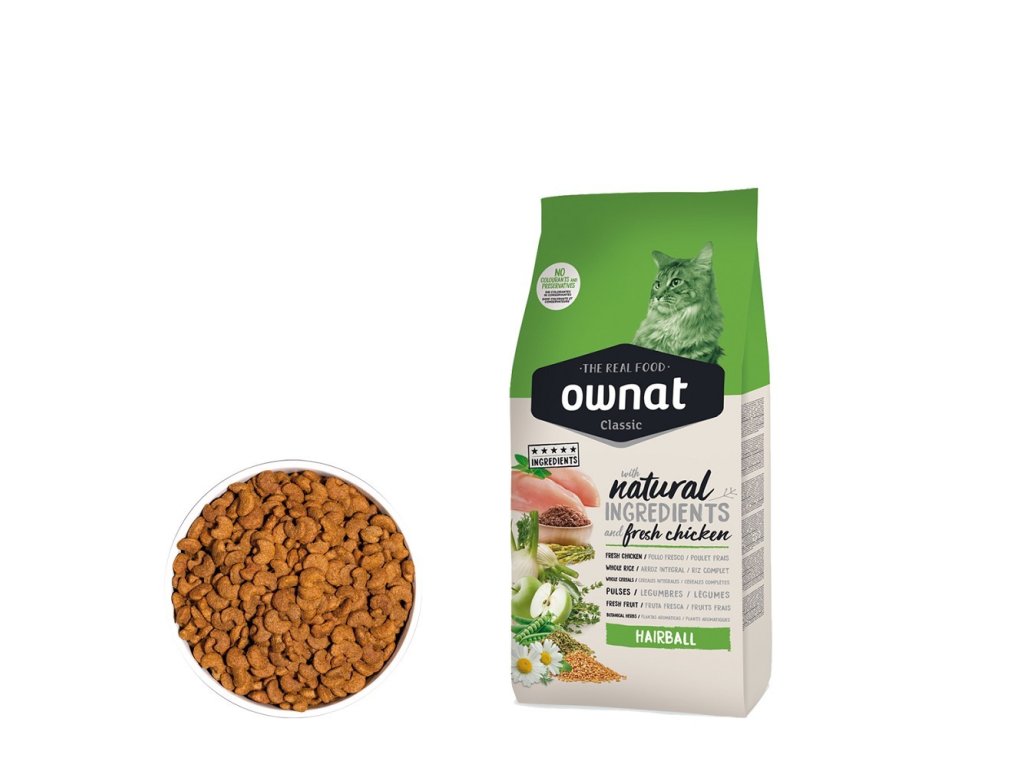 OWNAT CLASSIC CAT Hairball je krmivo určené speciálně pro kočky, které trpí tvorbou chomáčků chlupů. Toto krmivo je obohaceno o vlákninu, která napomáhá přirozenému průchodu chlupů trávicím systémem a snižuje riziko vzniku trichobezoárů. S vysokým obsahem kvalitních bílkovin z kuřecího masa poskytuje výživu, kterou kočky potřebují pro zdravou srst a celkové zdraví.