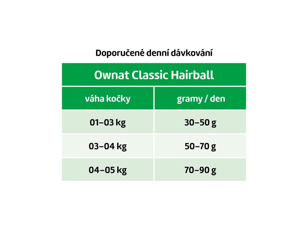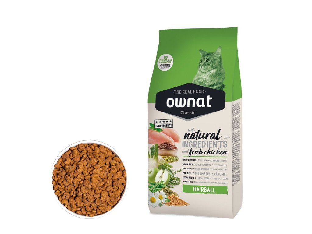 OWNAT CLASSIC CAT Hairball je krmivo určené speciálně pro kočky, které trpí tvorbou chomáčků chlupů. Toto krmivo je obohaceno o vlákninu, která napomáhá přirozenému průchodu chlupů trávicím systémem a snižuje riziko vzniku trichobezoárů. S vysokým obsahem kvalitních bílkovin z kuřecího masa poskytuje výživu, kterou kočky potřebují pro zdravou srst a celkové zdraví.