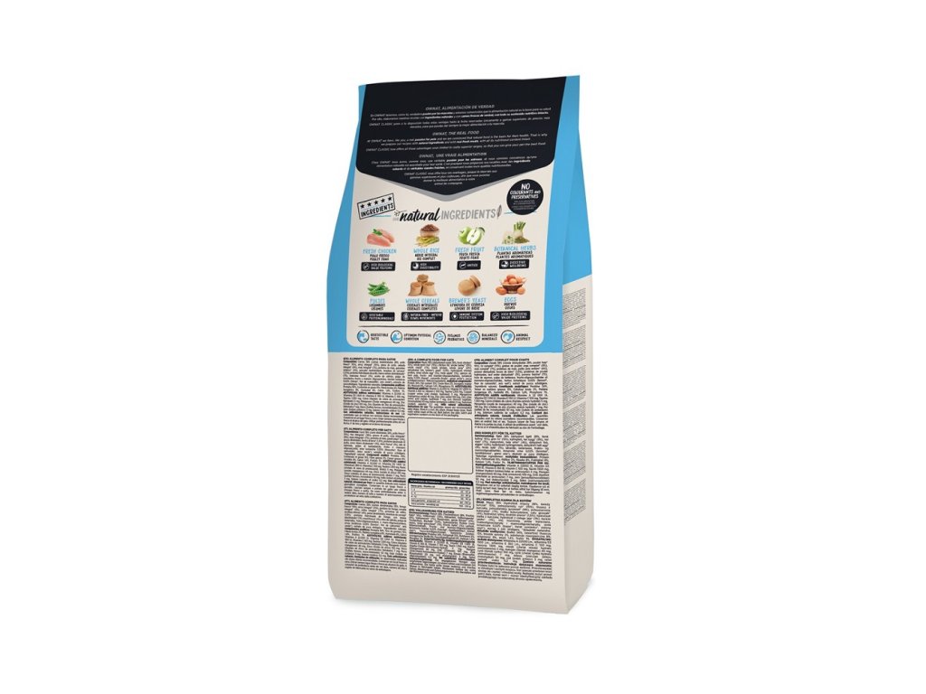SLOŽENÍ: Maso 38% (dehydratované maso 28%, čerstvé kuřecí maso* 10% před vytlačováním), hnědá rýže* (15%), kuřecí tuk, celozrnný ječmen* (9%), celozrnná kukuřice* (7%), kukuřičné proteiny, celý hrách* (4%), sušené ryby, pivovarské kvasnice* (1,5%), hydrolyzovaný kuřecí protein, celá sušená vejce* (1%), jablko* (1%), lososový olej, řepné řízky, fruktos- a mannan-oligosacharidy, aromatické byliny 0,02% (fenykl*, Heřmánkový květ*, anýz zelený*), juka schidigera.*Přírodní ingredience.