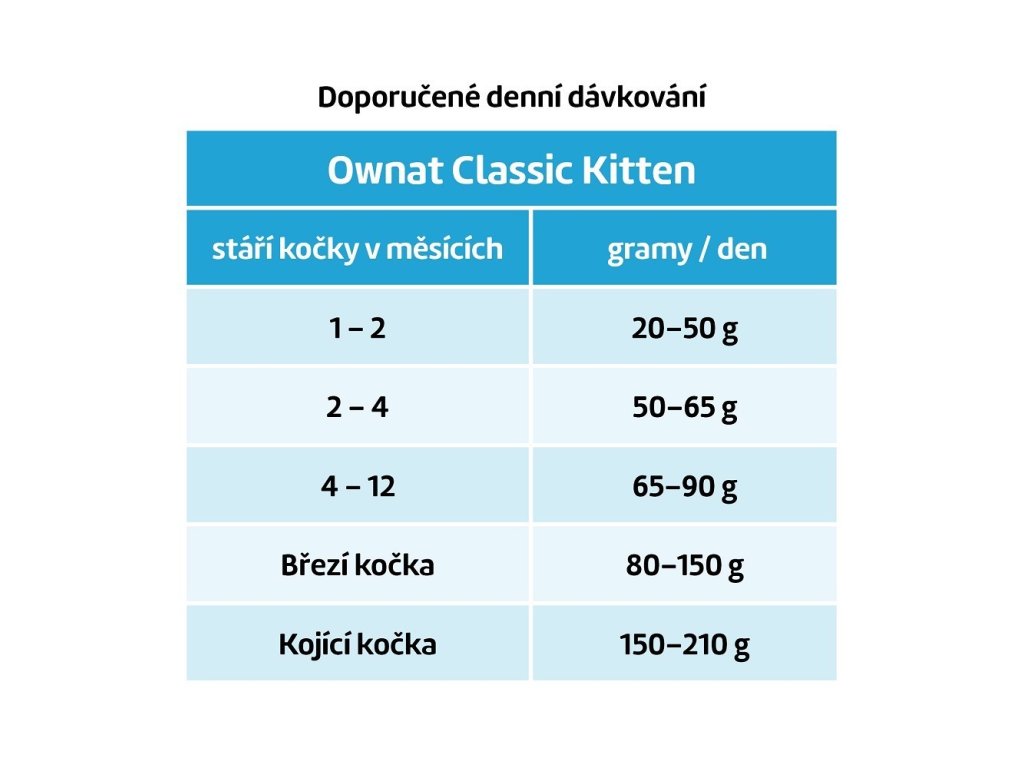 OWNAT CLASSIC CAT Kitten je speciálně navržené krmivo pro koťata, které poskytuje všechny nezbytné živiny pro správný růst a vývoj. Krmivo obsahuje vysoký podíl bílkovin z kvalitního kuřecího masa, které podporují růst svalů a rozvoj kostry. Díky pečlivě vybraným ingrediencím je strava snadno stravitelná a podporuje zdravé trávení a imunitní systém rostoucích koťat.