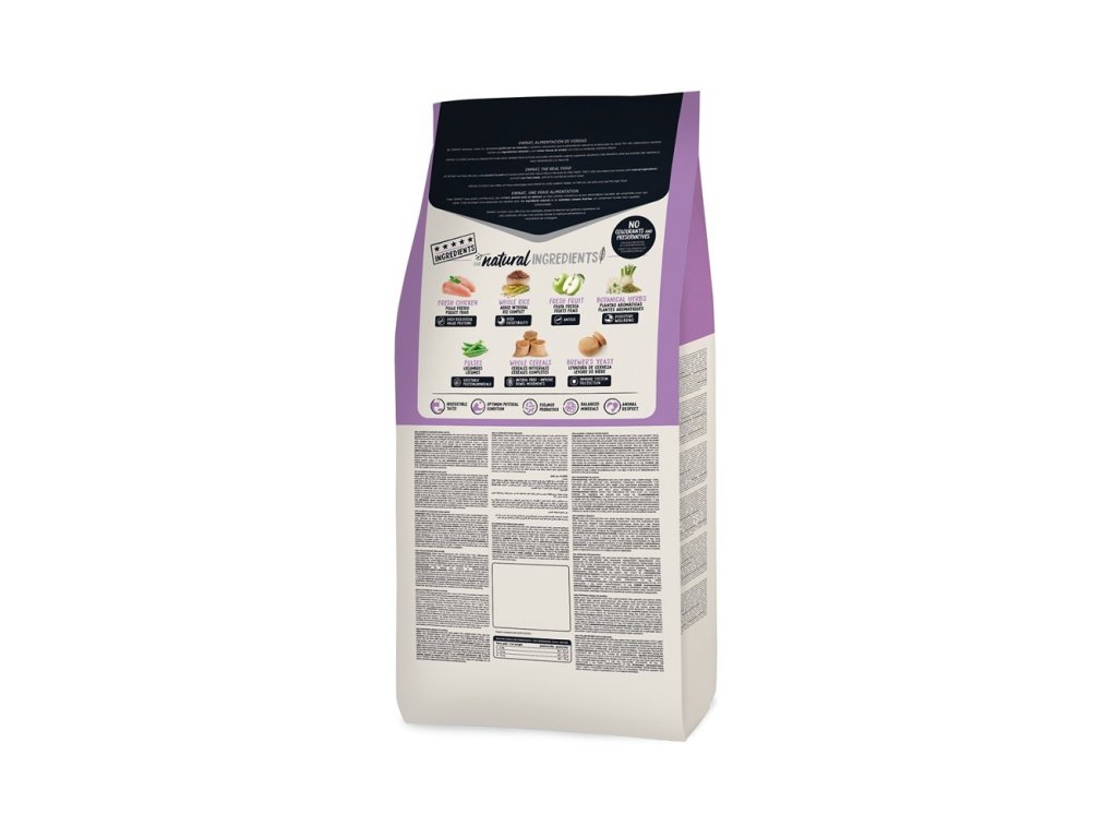 SLOŽENÍ: Maso 36% (dehydratované maso 26%, čerstvé kuřecí maso* 10% před vytlačováním), celozrnný ječmen* (10%), celý hrách* (9%), celozrnná kukuřice* (9%), kuřecí tuk, kukuřičné proteiny, celozrnná pšenice* (7%), lososový hydrolyzát (5%), hnědá rýže* (2%), pivovarské kvasnice* (2%), hydrolyzovaný kuřecí protein, jablko* (1%), lososový olej, řepné řízky, fruktos- a mannan-oligosacharidy, aromatické byliny 0,02% (fenykl*, heřmánkový květ*, anýz zelený*), juka schidigera.*Přírodní ingredience.