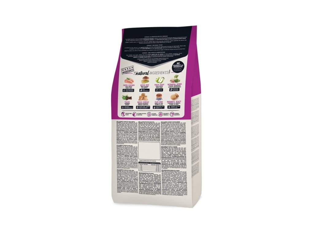 SLOŽENÍ: Maso 34% (dehydratované maso 24%, čerstvé kuřecí maso* 10% před vytlačováním), celozrnná pšenice* (18%), kuřecí tuk, celozrnná kukuřice* (8%), celozrnný ječmen* (8%), pšeničné otruby* (5%), hnědá rýže* (5%), celý hrách* (4%), svatojánský chléb* (2%), jablko* (1%), lososový olej, lněné semínko* (1%), řepné řízky, fruktos- a mannan-oligosacharidy, pivovarské kvasnice* (0,5%), aromatické byliny 0,02% (fenykl*, echinacea*, tymián*), juka schidigera. *Přírodní ingredience.