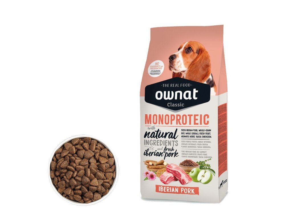 OWNAT CLASSIC MONOPROTEIC DOG Iberian Pork je ideální volbou pro majitele, kteří hledají kvalitní krmivo s jediným zdrojem bílkovin, které je zároveň chutné a výživné. Tyto kvalitní granule podpoří zdraví a pohodu vašeho psa každý den.