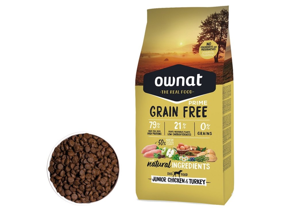 OWNAT GF PRIME DOG Junior Chicken & Turkey je ideální volbou pro majitele mladých psů, kteří chtějí svým mazlíčkům poskytnout kvalitní stravu pro zdravý a vyvážený růst.