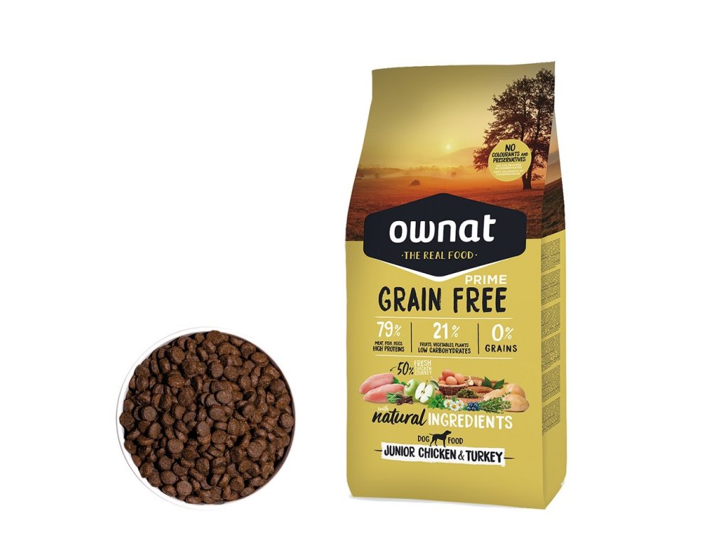 OWNAT GF PRIME DOG Junior Chicken & Turkey je ideální volbou pro majitele mladých psů, kteří chtějí svým mazlíčkům poskytnout kvalitní stravu pro zdravý a vyvážený růst.
