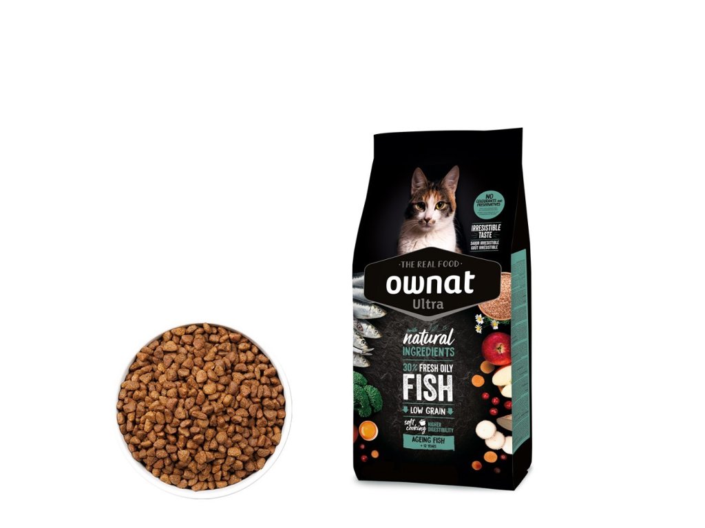 Ownat Ultra Ageing Fish je speciálně navrženo pro kočky starší 12 let, které potřebují výživu vyhovující vyšším nárokům na stravitelnost, chutnost a udržení tělesné kondice. Obsahuje 30 % čerstvé ryby a 12 % hydrolyzátu z lososa, což zajišťuje vysoce kvalitní a lehce stravitelné bílkoviny.