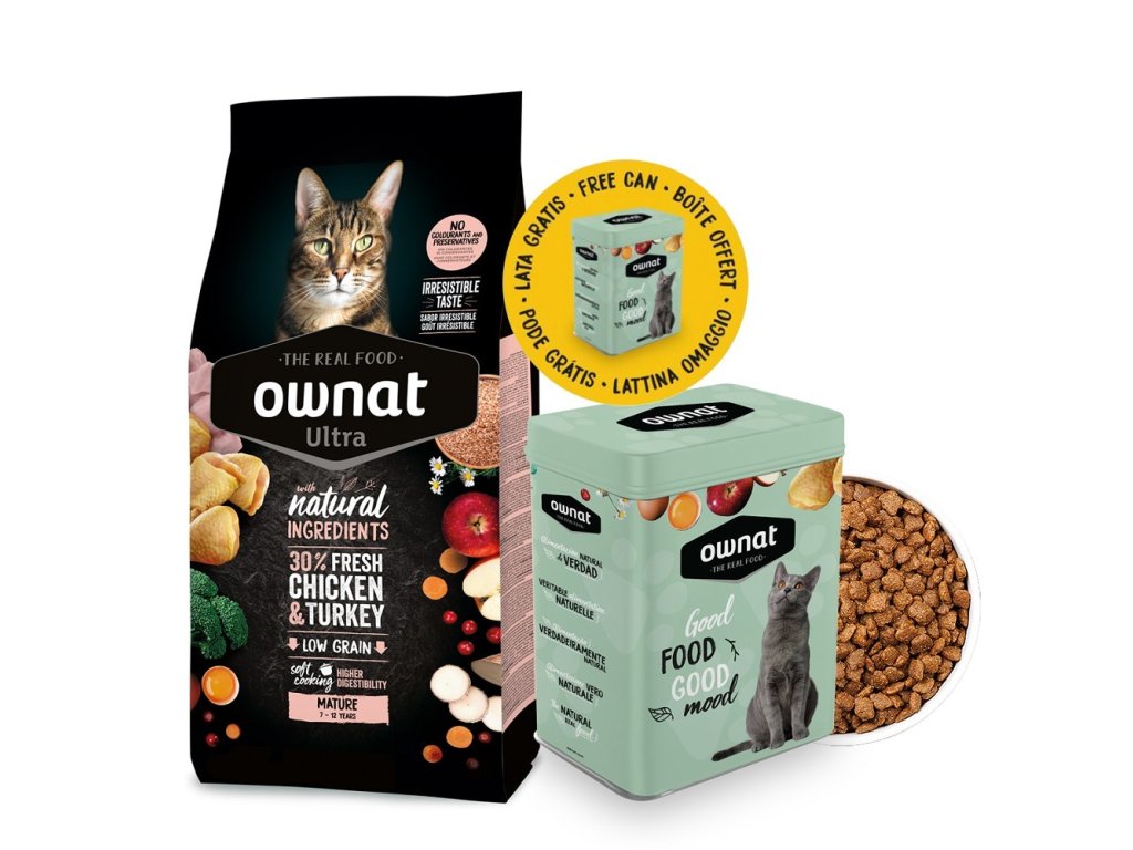Ownat Ultra Mature je vyvážené krmivo vytvořené na míru nutričním potřebám starších koček od věku 7 let. Obsahuje 30 % čerstvého kuřecího a krůtího masa, doplněného o vejce, rybí proteiny a další funkční složky, které zajišťují skvělou chutnost a optimální trávení i výživu v pokročilejším věku.