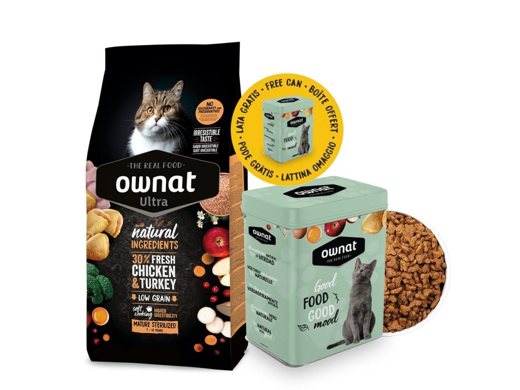 Ownat Ultra Mature Sterilized je ideální volbou pro kastrované seniorská kočky, které mají nižší úroveň aktivity a zvýšené nároky na výživu. Díky 30 % čerstvého kuřecího a krůtího masa poskytuje vysokou biologickou hodnotu bílkovin, zatímco snížený obsah tuku a vysoký podíl vlákniny napomáhají kontrole hmotnosti a zdravému trávení.