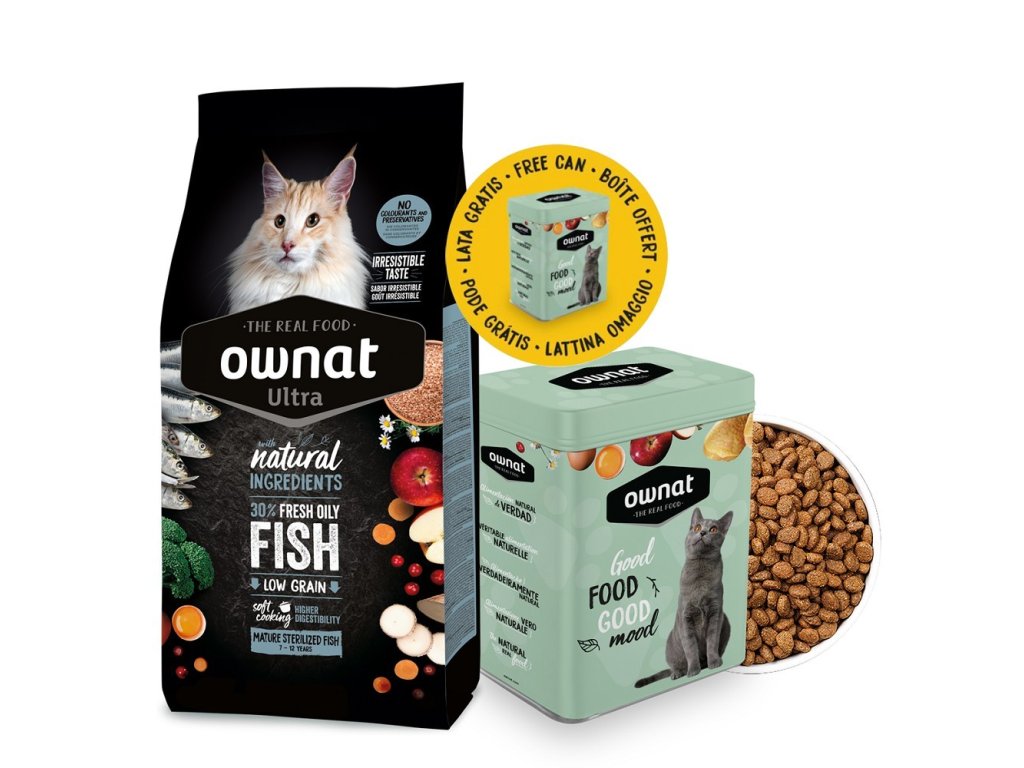 Ownat Ultra Mature Sterilized Fish je speciálně vyvinuto pro výživové potřeby kastrovaných koček od 7 let věku. Vysoký podíl čerstvé tučné ryby (30 %) a vaječné bílkoviny zajišťují výbornou chutnost, vysokou biologickou hodnotu bílkovin a zároveň podporují zdravou svalovou hmotu. Díky nižšímu obsahu tuku, zvýšené vláknině a přítomnosti prebiotik přispívá ke kontrole hmotnosti, prodlužuje pocit sytosti a podporuje zdravé trávení.