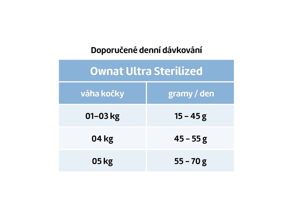OWNAT ULTRA CAT Sterilized je ideální volbou pro sterilizované kočky, které potřebují nižší příjem kalorií, ale stále vyžadují vysoce kvalitní bílkoviny a živiny pro zdravý životní styl.