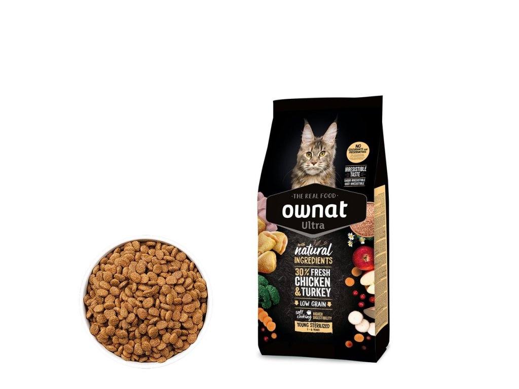 Ownat Ultra Young Sterilized je určené pro sterilizované kočky s běžnou aktivitou, u kterých je důležité udržet optimální tělesnou kondici. Obsahuje 30 % čerstvého kuřecího a krůtího masa, vysoký podíl bílkovin a zároveň nižší obsah tuku a vyšší obsah vlákniny, která pomáhá navodit pocit sytosti a podpořit zdravé trávení.