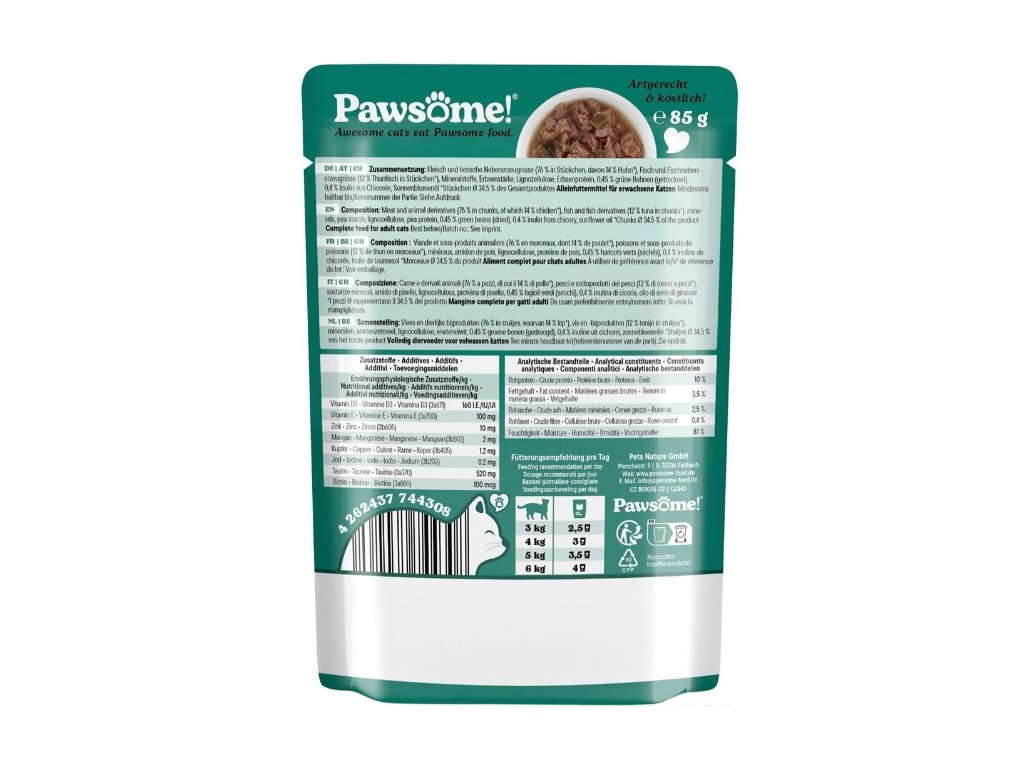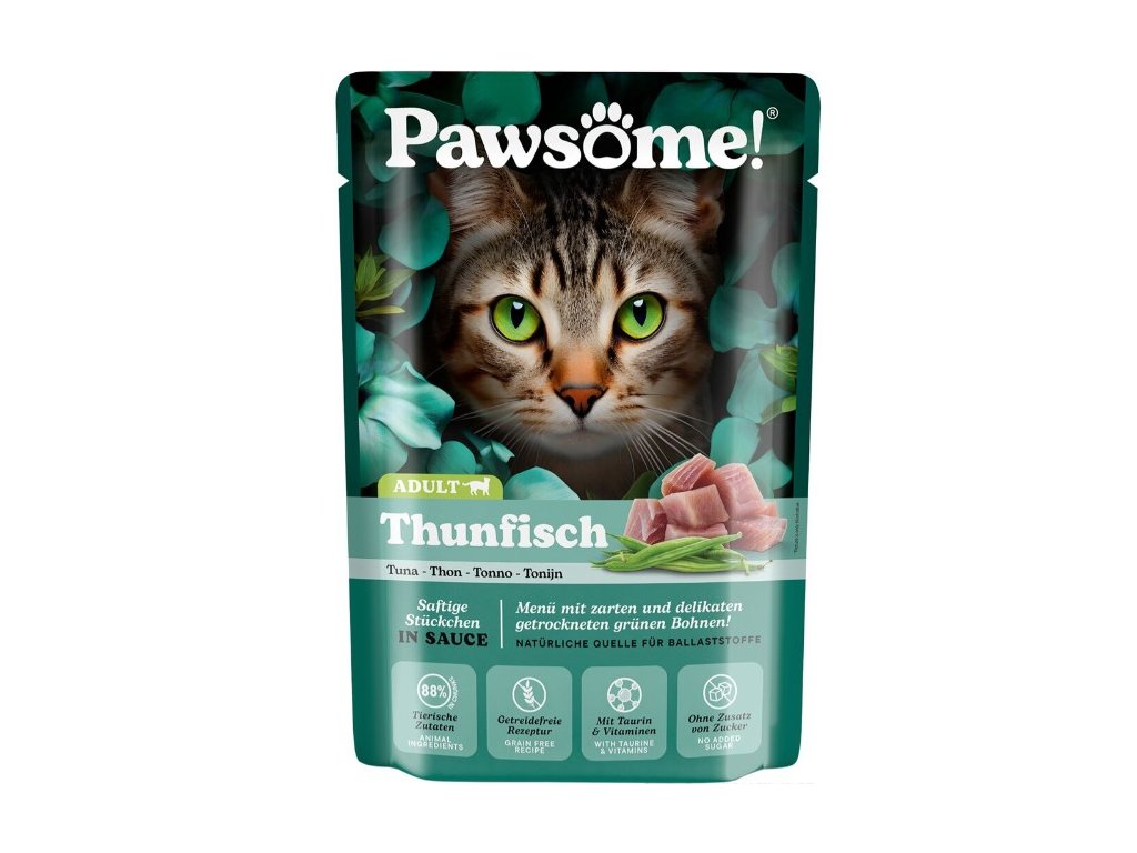 Kočky jsou masožravci, a proto krmivo Pawsome! obsahuje velké množství živočišných bílkovin a nenajdete v něm obiloviny ani přidaný cukr – protože ani jedno do kočičí misky nepatří. Je vytvořeno tak, aby poskytovalo kočkám jedinečný chuťový zážitek a zároveň jim dodalo živiny, nezbytné pro jejich každodenní dobrodružství.