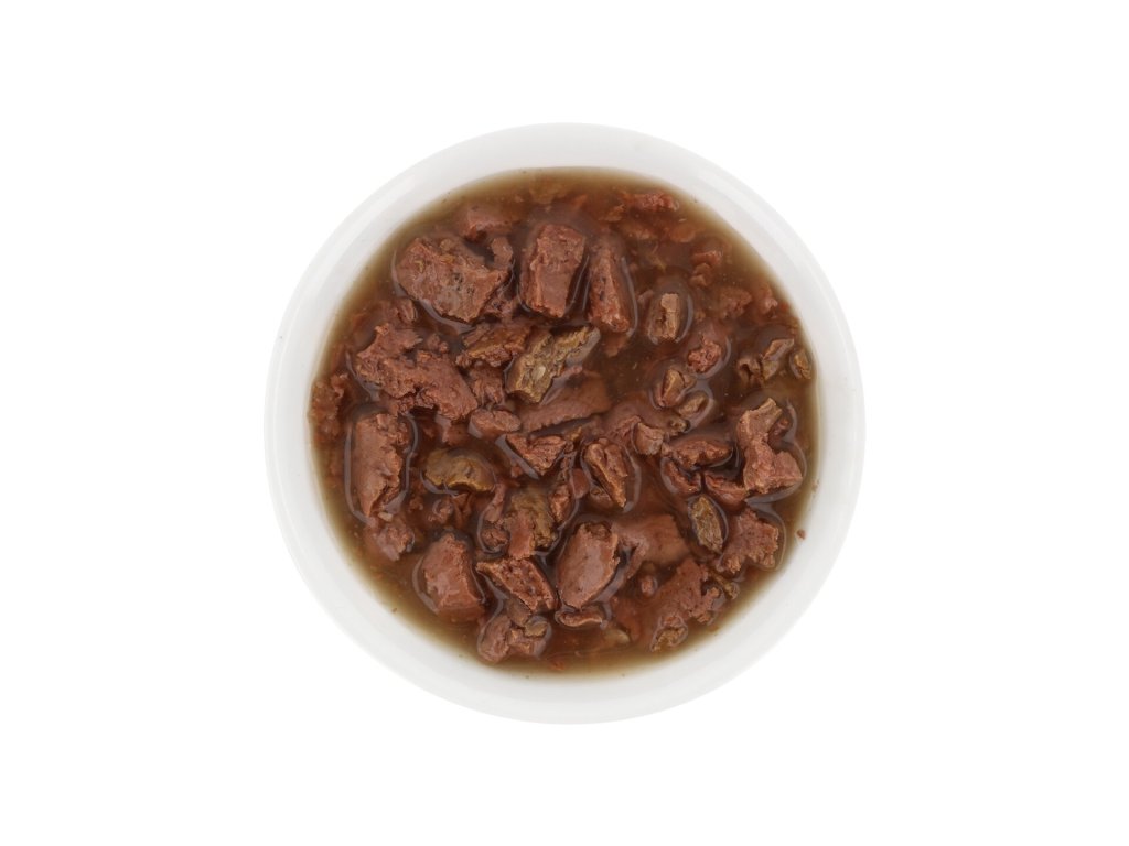 Složení: maso a vedlejší výrobky živočišného původu (kousky masa 88 %, z toho hovězí maso 11,6 %), minerální látky, hrachový škrob, slunečnicový olej, hrachová bílkovina, čekankový inulin 0,4 %, lignocelulóza