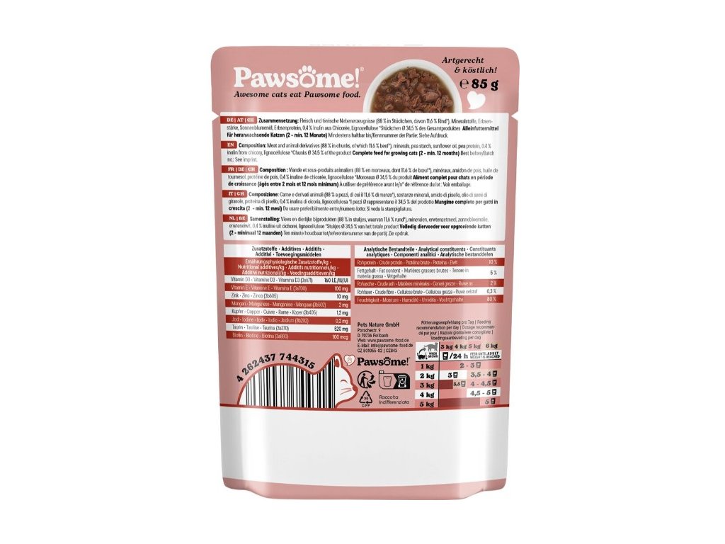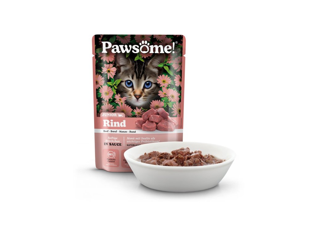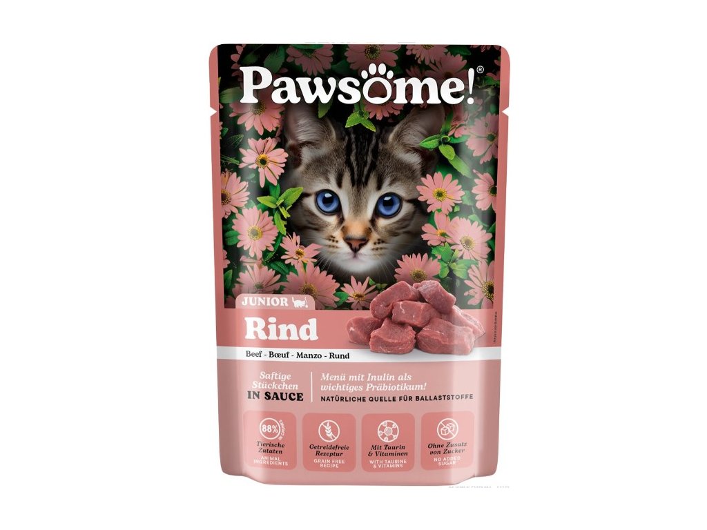 Kočky jsou masožravci, a proto krmivo Pawsome! obsahuje velké množství živočišných bílkovin a nenajdete v něm obiloviny ani přidaný cukr – protože ani jedno do kočičí misky nepatří. Je vytvořeno tak, aby splňovalo očekávání i těch nejmlsnějších mazlíčků a zároveň zajišťovalo jejich zdraví, vitalitu a celkovou spokojenost. Jeho delikátní chuť, vůně a kombinace kousků masa a omáčky nabízí kočkám jedinečný chuťový zážitek a zároveň jim dodává živiny nezbytné pro jejich každodenní dobrodružství.